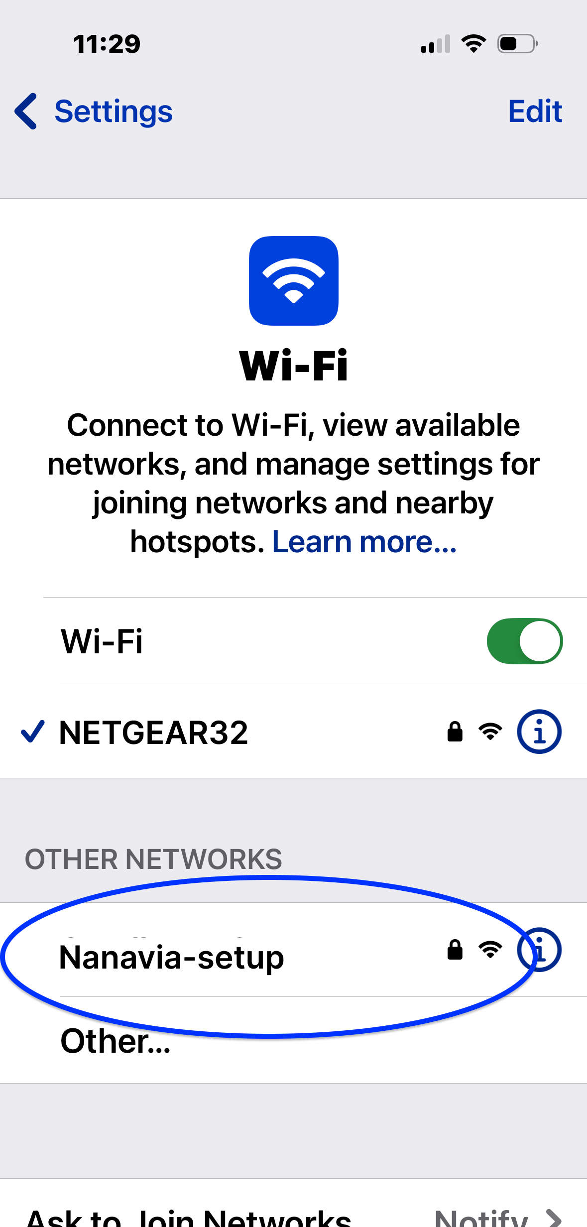 After a moment a Nanavia Wifi Setup screen will appear. Choose your Wifi network and enter