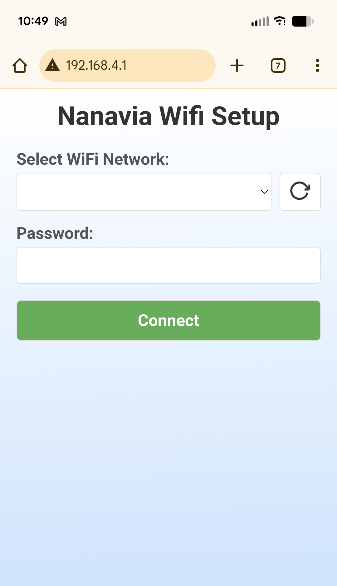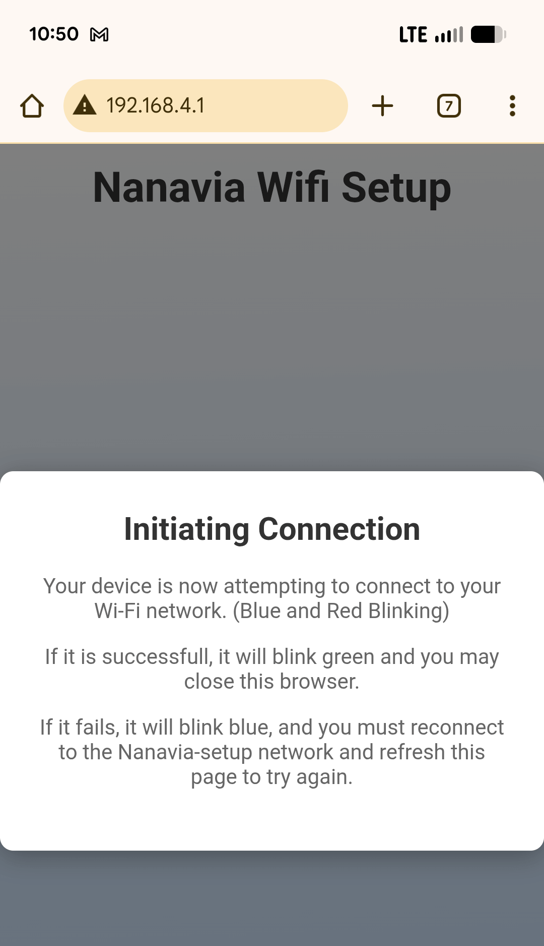 When you click “Connect” the webpage will disconnect from the device and show a message,